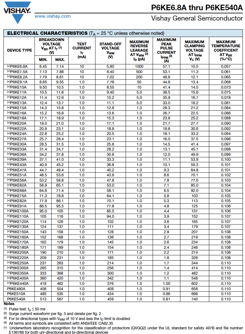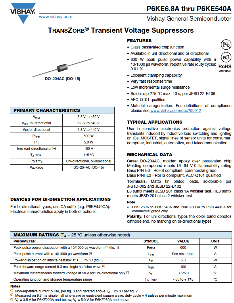 P6KE6.8A ~ P6KE540A 600W 5.8V~459V